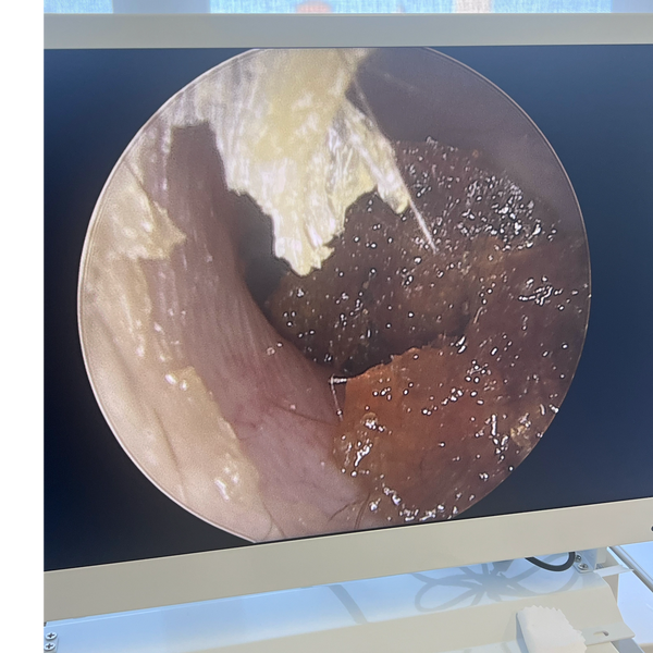 Endoscopic removal of a foreign body in the ear using the endoscope and ENT crocodile forceps.